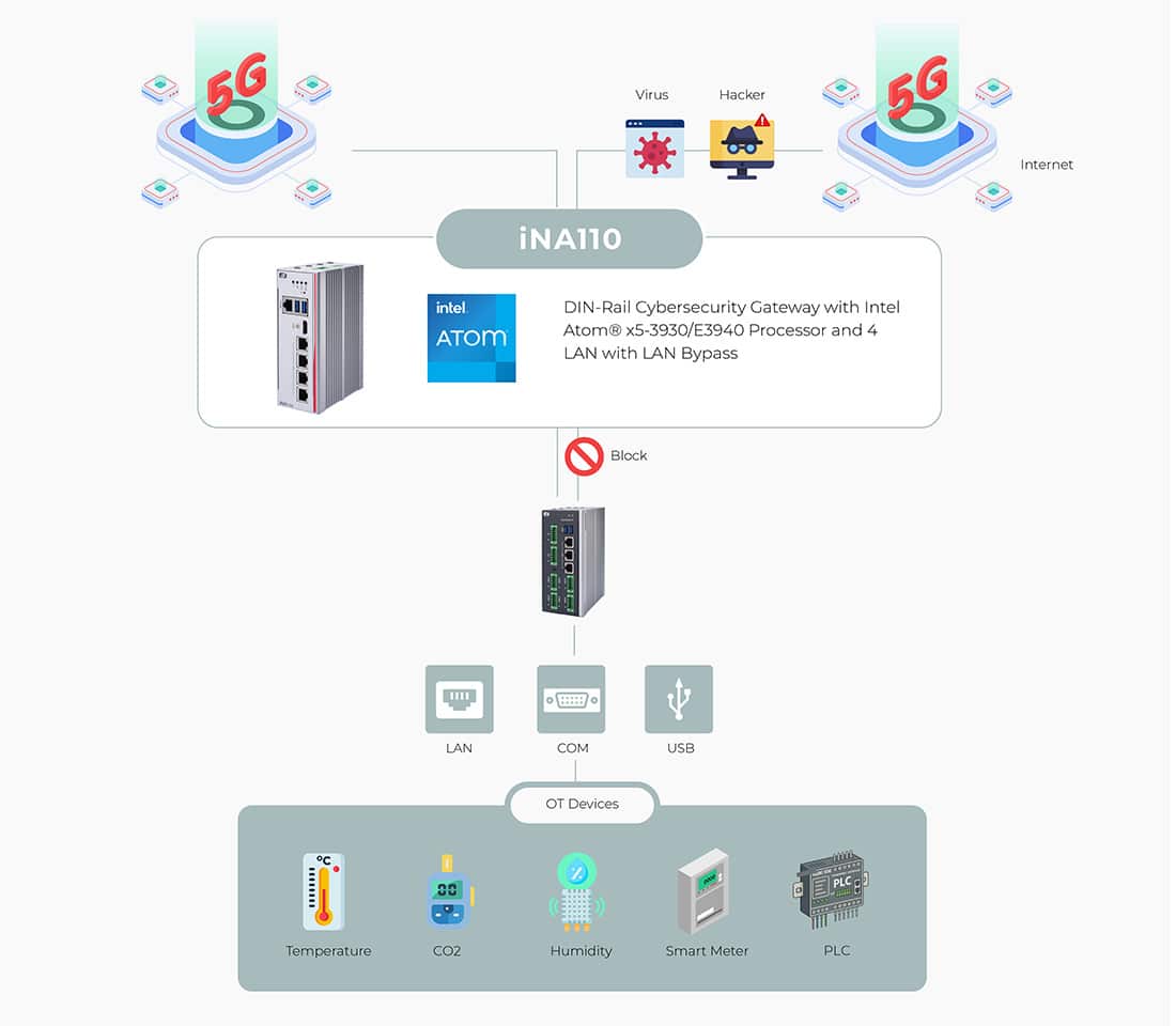 Der iNA110 ist mit vier Intel® I210-IT GbE-LAN-Ports ausgestattet – darunter ein LAN-Bypass-Paar – und stellt so eine unterbrechungsfreie, ausfallsichere Verbindung für SD-WAN-Edge-Installationen sicher. Diese robuste Netzwerkinfrastruktur schützt die Kommunikation zwischen OT-Endpunkten und cloudbasierten Sicherheitsplattformen – mithilfe verschlüsselter Tunnel zur Absicherung kritischer Daten.